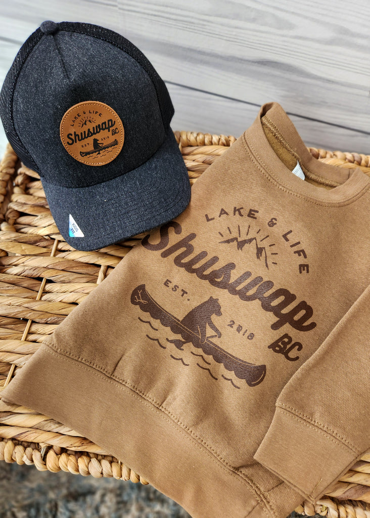 Say Hello to The Shu Bear! This organic design features The Shu Bear enjoying a leisurely paddle around the Shuswap to take in all the amazing views! Look closely and you'll find the Shuswap H proudly engraved on Shu Bear's canoe. Packed with Shuswap and Canadian inspiration, this design is a tried and true favourite!
